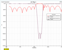 根據(jù)前面的分析,采用支線式結(jié)構(gòu)設(shè)計濾波器能夠滿足15%阻帶帶寬的要求,根據(jù)阻帶衰減要求,取n=10,采用RT/durold®6002陶瓷板作為基板,相對于微帶線來說,懸置帶線能夠減小損耗,能夠獲得更加優(yōu)越的過渡帶特性。在ADS中建立原理圖,給出各短截線及主線的初值并優(yōu)化,從而得到帶阻濾波器的各結(jié)構(gòu)參數(shù)的較準(zhǔn)確的值,在此基礎(chǔ)之上,采用Ansoft公司的三維電磁場仿真軟件HFSS建立三維模型,進行參數(shù)掃描或者優(yōu)化,確定參數(shù)的精確值,得到滿足指標(biāo)要求的仿真曲線,如圖3所示,阻帶衰減大于45dB的范圍約為16%,通帶插損不大于2.0dB,滿足設(shè)計指標(biāo)的要求。這樣,既利用了原理圖設(shè)計的簡單性及快速性,又利用了三維電磁場仿真的準(zhǔn)確性,從而可以快速而準(zhǔn)確的設(shè)計出所需要的濾波器電路。